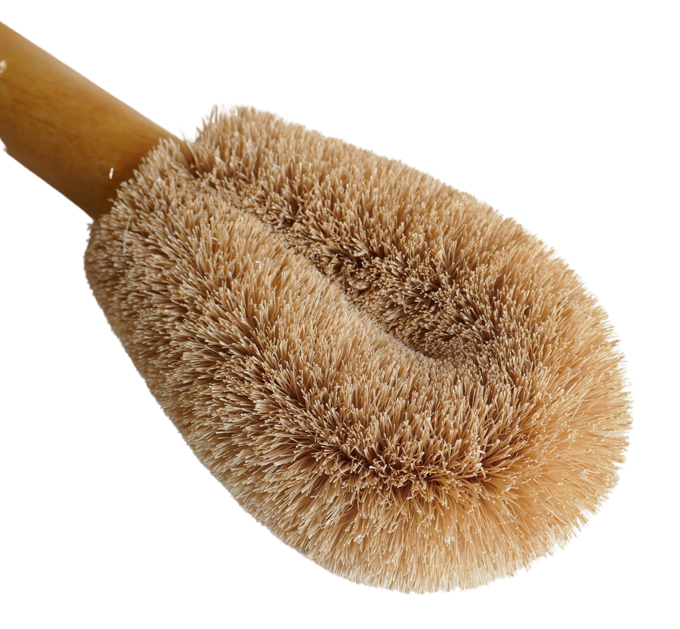 Material: gebleichte Kokosfaserfaser, Holzgriff aus FSC-zertifiziertem Gummibaumholz, lackiert mit Leinsamenöl, galvanisierter Eisendraht