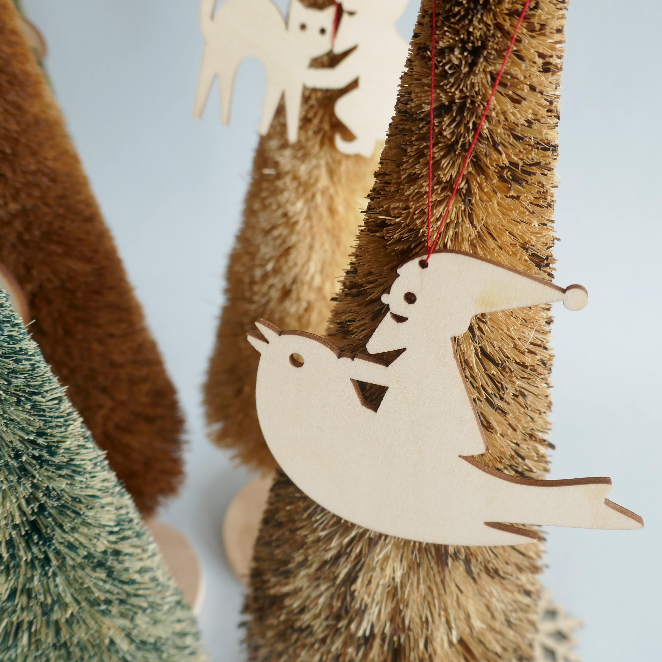 Der Wichtel fliegt mit einem Vogelchen. Die Wichtel haben einen roten dünnen Schnur zum Aufhängen.