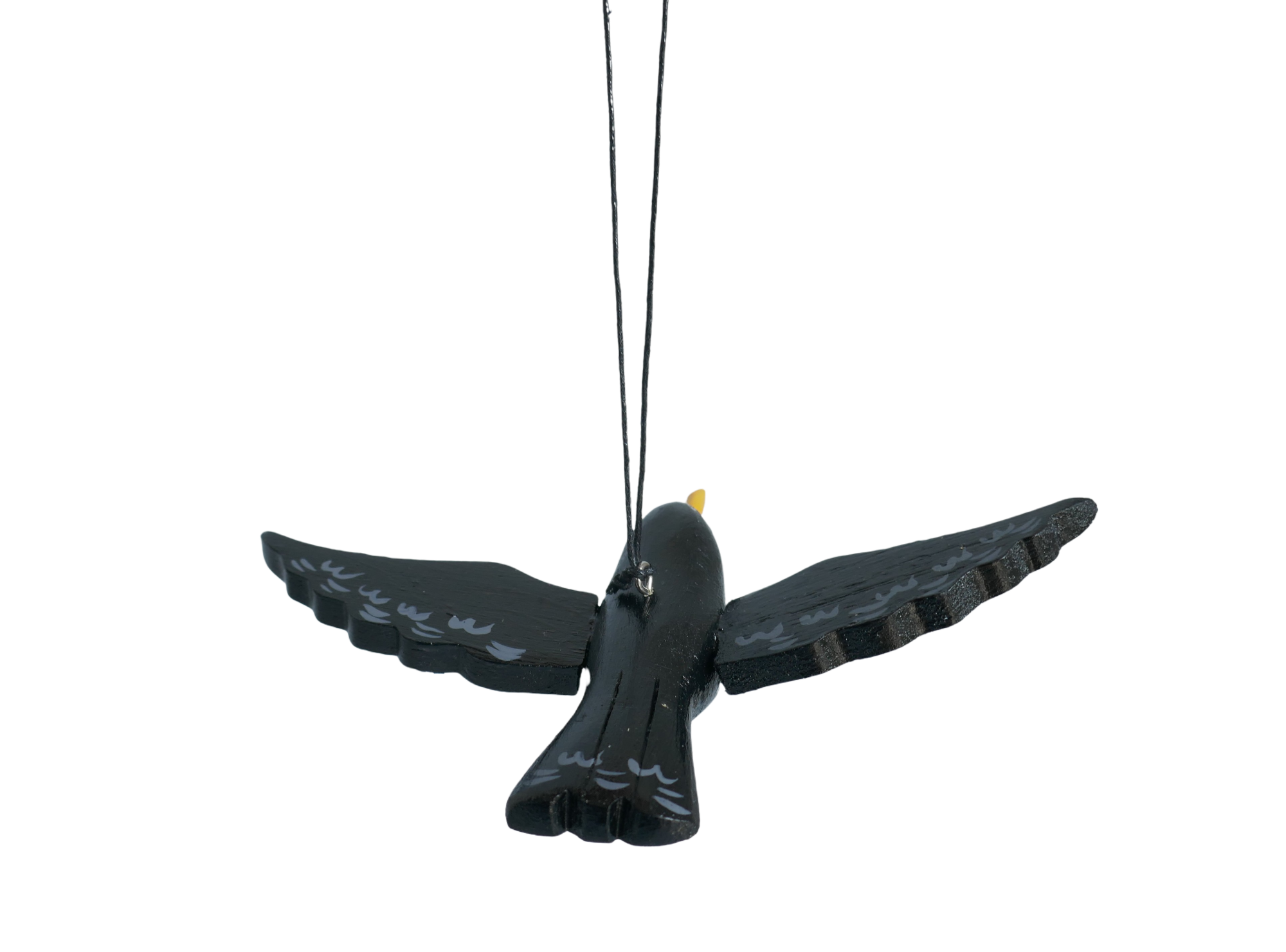 Dieser elegante, schwarze Dekovogel in Form einer Amsel ist ein handgedrechseltes und -bemaltes Kunstwerk.